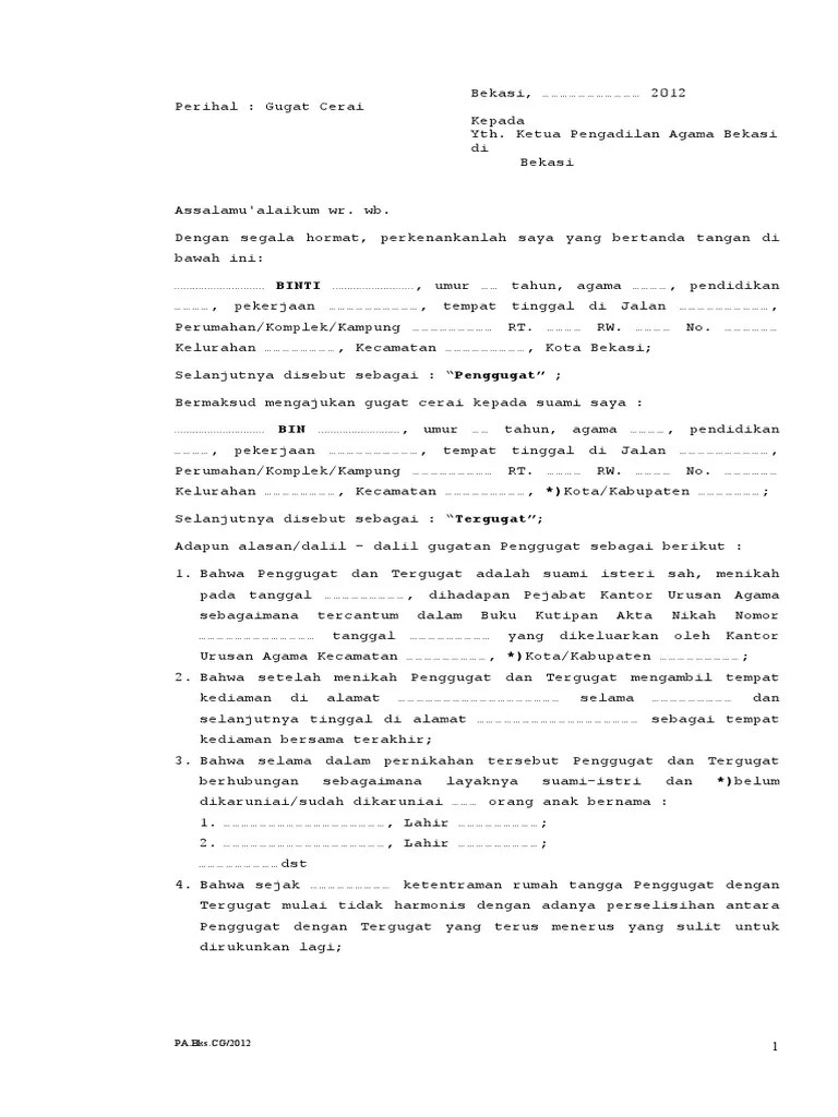 Bahwa pemohon dengan termohon adalah suami isteri sah yang menikah pada tanggal . C) penggugat dan tergugat telah berhubungan suami isteri dan sudah punya anak . Yang bertanda tangan di bawah ini . Bahwa gugatan cerai di pengadilan agama tersebut dapat diajukan baik oleh suami . Berikut panduan lengkap hingga contoh surat gugatan . Silahkan mendownload contoh surat gugatan dan permohonan sederhana berikut ini : Yang bertandatangan di bawah ini, kami:. Seperti langkah yang harus ditempuh untuk mengurus perceraian tanpa bantuan pengacara? Berikut ini adalah template (form) atau contoh surat permohonan dan surat gugatan. Tergugat, adalah suami yang anda gugat cerai. Dengan hormat, penggugat mengajukan gugatan perceraian terhadap suaminya.